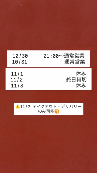 貸切営業が多くなりますので、まとめてご報告させていただきます。